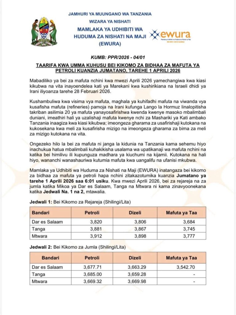 Mamlaka ya Udhibiti wa Huduma za Nishati na Maji (EWURA) inachapisha Bei za bidhaa za mafuta, zinazotumika Tanzania Bara, kuanzia Jumatano, tarehe 4 Machi 2026 saa 12:01 asubuhi. Mnamo Machi 2026, bei za rejareja na jumla za bidhaa za mafuta jijini Dar es Salaam, Tanga, na Mtwara zimeonyeshwa katika Jedwali 1 na 2, mtawalia.