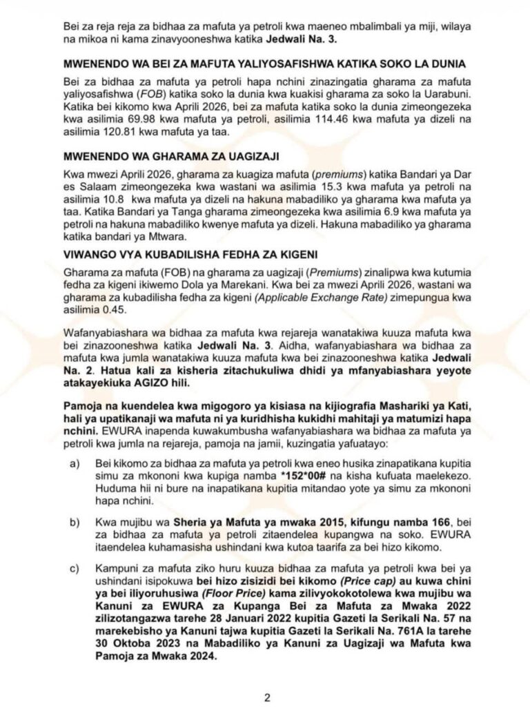 EWURA Bei Mpya Za Mafuta Petroli April 2026