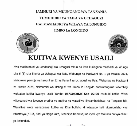 Majina ya Usaili kusimamia Uchaguzi NEC 2025 – Jimbo la Longido