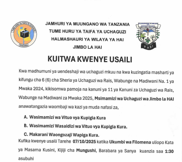 Hapa Chini ni PDF ya majina ya walioitwa kwenye usaili wa NEC kusimamia uchaguzi Wilaya ya Hai 2025