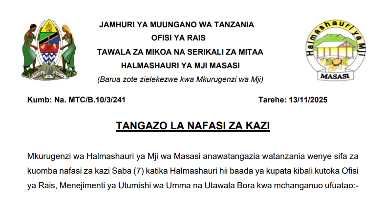 Mkurugenzi wa Halmashauri ya Mji wa Masasi anawatangazia watanzania wenye sifa za
