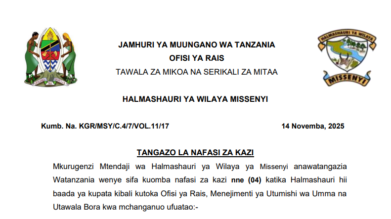 Nafasi za Kazi Halmashauri ya Wilaya ya Missenyi